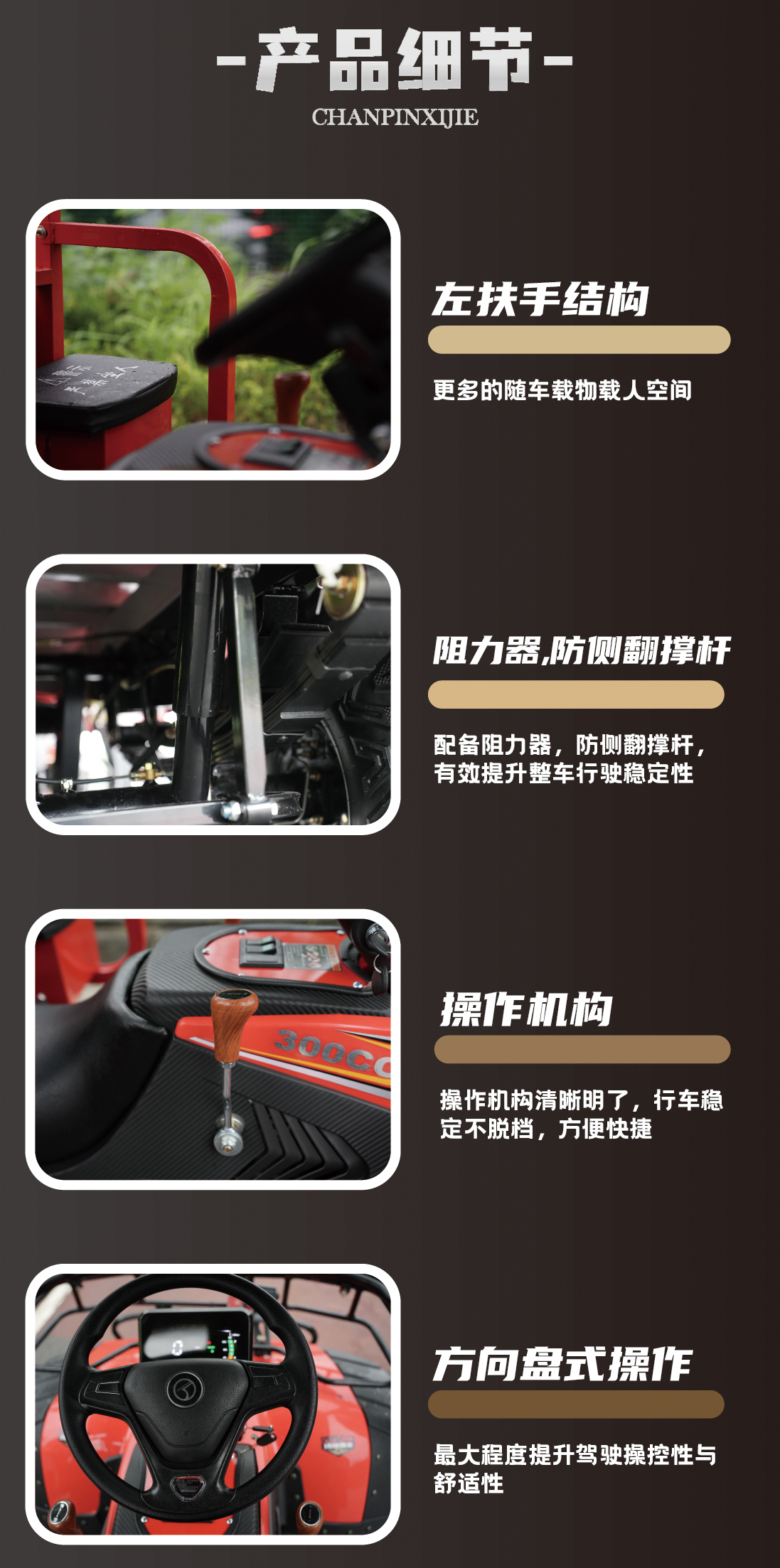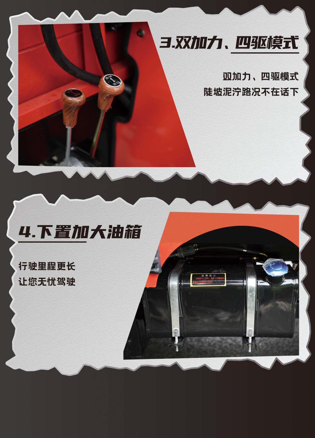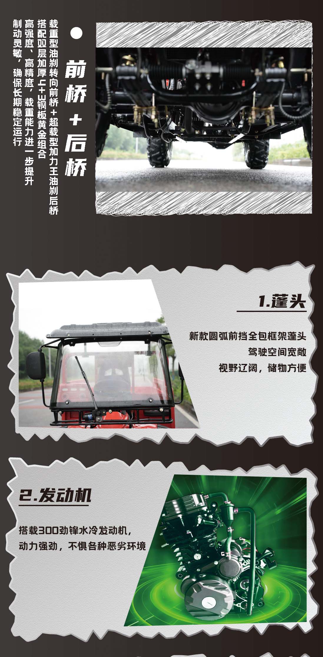 Large loading capacity, up to 2000kg, 4X4 and 6X6 can be selected, which can be widely used in agriculture, army, engineering construction, forest. It is suitable for farmland, desert, mountain, muddy road, ice and snow road and other bad road conditions.